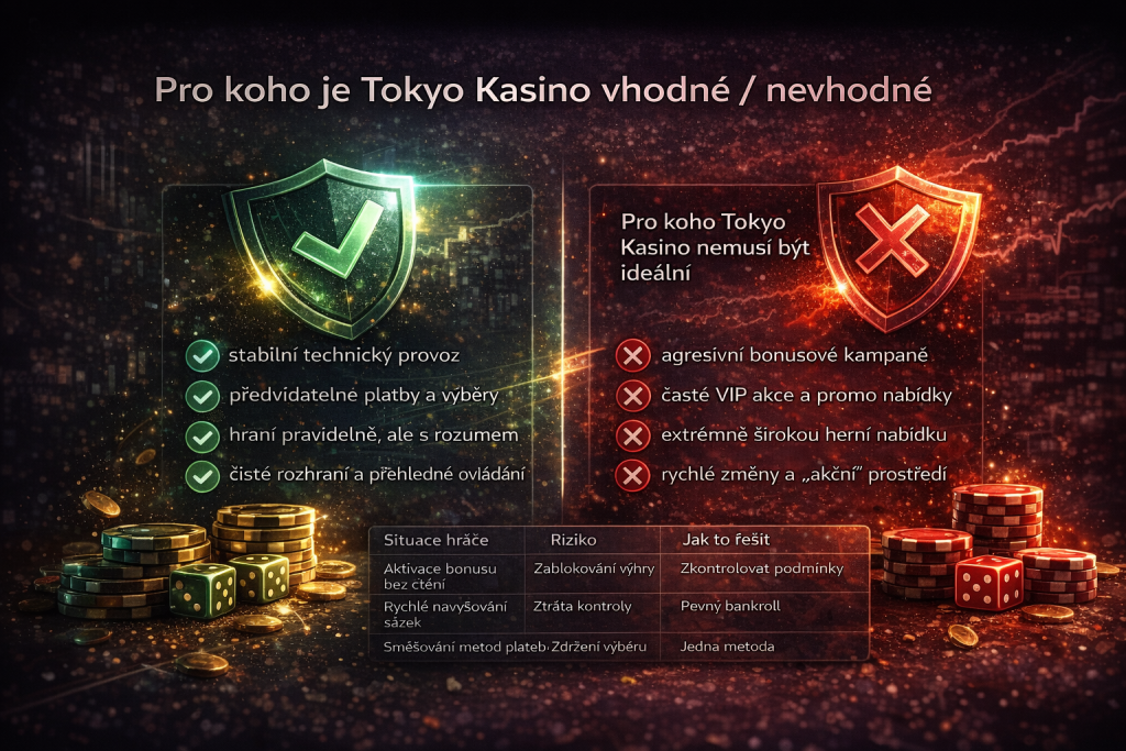 Během testování Tokyo Kasino jsem si postupně udělal poměrně jasný obraz o tom, pro jaký typ hráčů je tato platforma vhodná a komu naopak nemusí úplně vyhovovat. Nejde o hodnocení „dobré vs. špatné“, ale spíše o to, jaký styl hraní a očekávání Tokyo Kasino podporuje.